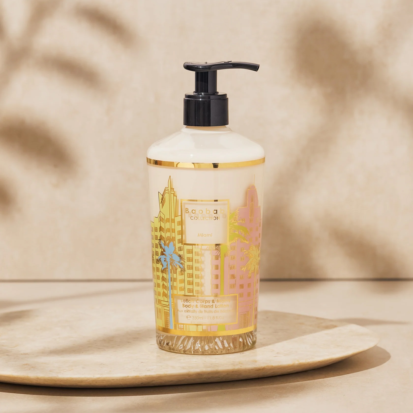 Gehuld in een glazen flacon versierd met een gouden zeefdruk en pastelkleuren die doen denken aan de Art Deco gebouwen van South Beach. De geparfumeerde body- en handlotion Miami kan in de badkamer worden geplaatst als een decoratief object. De textuur van de delicaat gekleurde, lichtgele lotion is zichtbaar door het glas, waardoor de stijlvolle decoratie opvalt. De zowel lichte als hydraterende lotion wordt op het lichaam aangebracht als een tweede huid, een moment van intieme en opbeurende zachtheid.